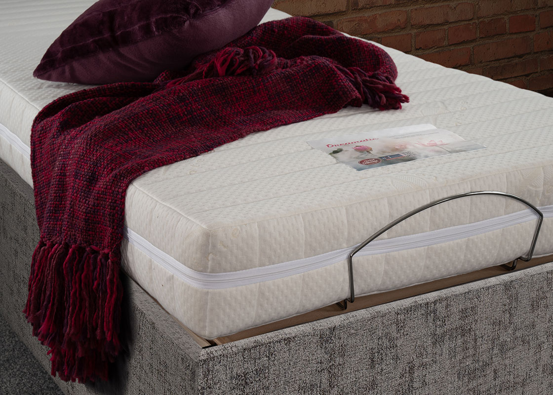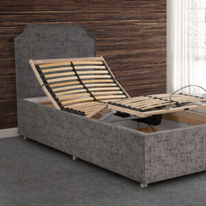 The Dreamatic adjustable bed comes complete with supersoft richguard extra foam block mattress which is double sided and with a removeable (dry clean only) in a soft knitted cover. The base has a laminated, beech slatted base with twin wheel castors, available in 3 deluxe fabrics in silver, smoke and wheat colour fabrics, an easy to use hand control  and five stage adjustable action. Mattress depth 16cm, base height 40cm. Matching headboard available from £99. Sizes available 2’6, 3′, 4′ and 5′ and 6′ has two separate adjustable bases and mattresses and motors which link together. British made. Estimated delivery 2-3 weeks.  FREE set up on all adjustable beds.
