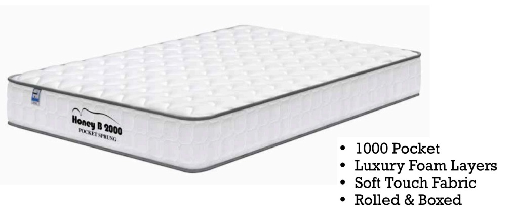 The Honey B 2000 pocket sprung mattress consists of 1000 individual pocket springs with foam fillings with a quilted soft fabric to give a luxurious medium feel with a depth of 23cm. This mattress is our starting price on pocket sprung mattresses without losing the quality. The mattress comes rolled up and boxed so we can keep stocks of this mattress to offer quick delivery.