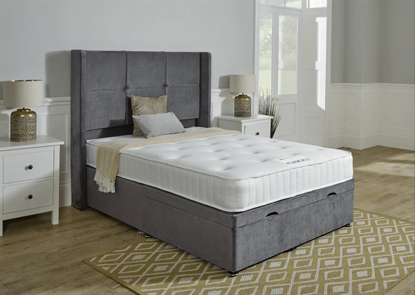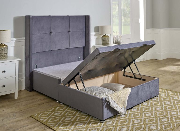 All of our Ottoman bases are British made and are made of solid MDF wood including the bottom giving it a very strong storage base with gas lift struts to keep up the storage lid in a variety of fabrics, damask, velour, and wool and colours and sizes with glides for feet. The hybrid version is a half storage base option which gives you more cubic space than a standard two drawer base, this base is compatible with pocket sprung or memory foam mattresses due to the half opening action. The base is already constructed, for larger sizes the base comes in two halves and bolt and clip together. For the extra storage needed an ottoman base with gas lift struts may be the option to go for with an end opening. Sizes available 4′, 4’6, 5′, 6′. Matching colour headboards are available. Estimated delivery 1-2 weeks if not in stock.