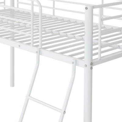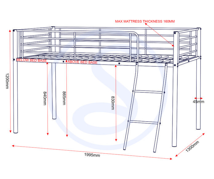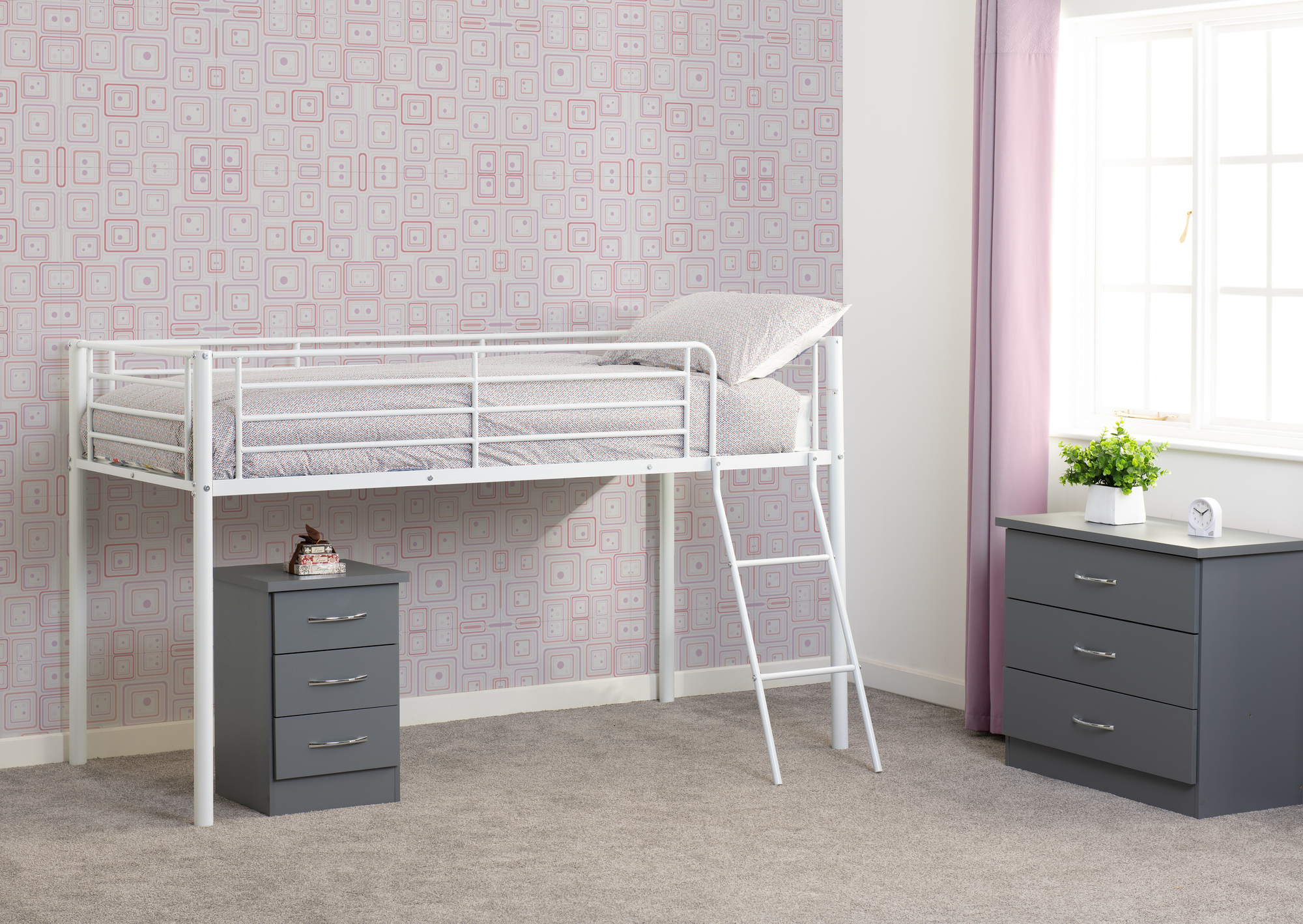 The Kora metal mid sleeper bed is available in silver, white or black finish, the bunk has heavy duty metal base, 32mm tube posts and sloping ladder. Ideal for rooms what require extra storage underneath. Requires 1 x 90 x 190cm mattresses. Boxed for home assembly.