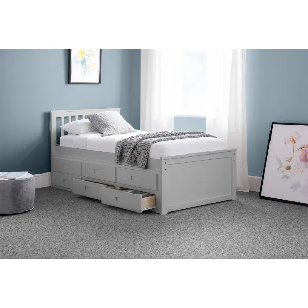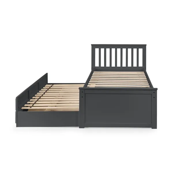 The Macey is the complete solution for rooms what need it all, a shaker style bedframe, three storage drawers and an underbed for guests. Solid pine slats for strength and durability. Available in 3 colours an off white, dove grey and anthracite. Requires 2 x standard single mattresses. Boxed for home assembly. Estimated delivery if out of stock 2 weeks.