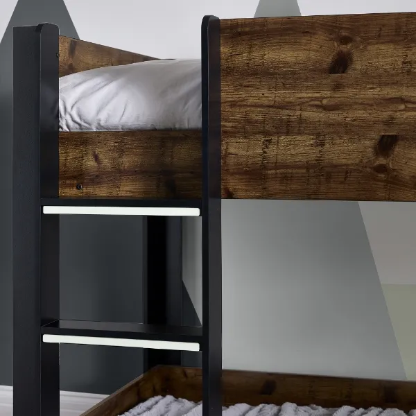 The Solar Bunk Bed frame features a boarded headboard and footboard. Also a key feature are the wide step ladder with glow in the dark steps. Available in an urban black and rustic finish or a crisp white finish. Requires 2 x standard single mattresses. Boxed for home assembly. Estimated delivery if out of stock 2 weeks.