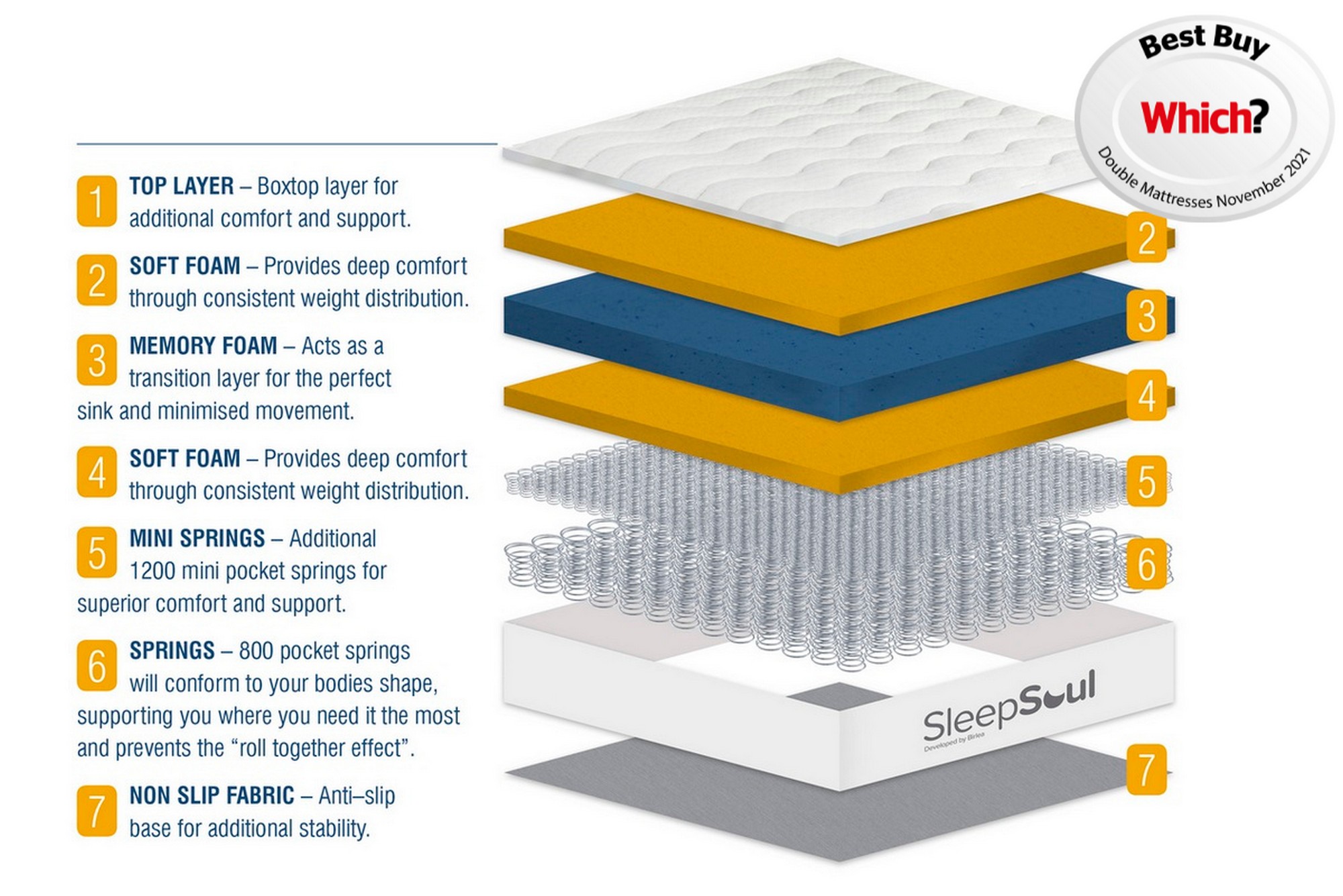The Space 2000 mattress is an award winning mattress voted by Which magazine. The mattress provides complete support from head to toe with a medium/firm rating featuring a sumptuously soft pillow top layer of plush fillings for extra comfort and cushioning, features 2000 pocket springs and a box top layer which will conform to your bodies shape, supporting you where you need it most and preventing the roll-together effect. The mattress come’s vacuum packed which takes up to 24 hours till fully expanded. 10 year manufacturers warranty with this mattress. Mattress depth 34cm. Sizes available 3′, 4’6, 5′, 6′. Estimated delivery if not in stock 2 weeks.