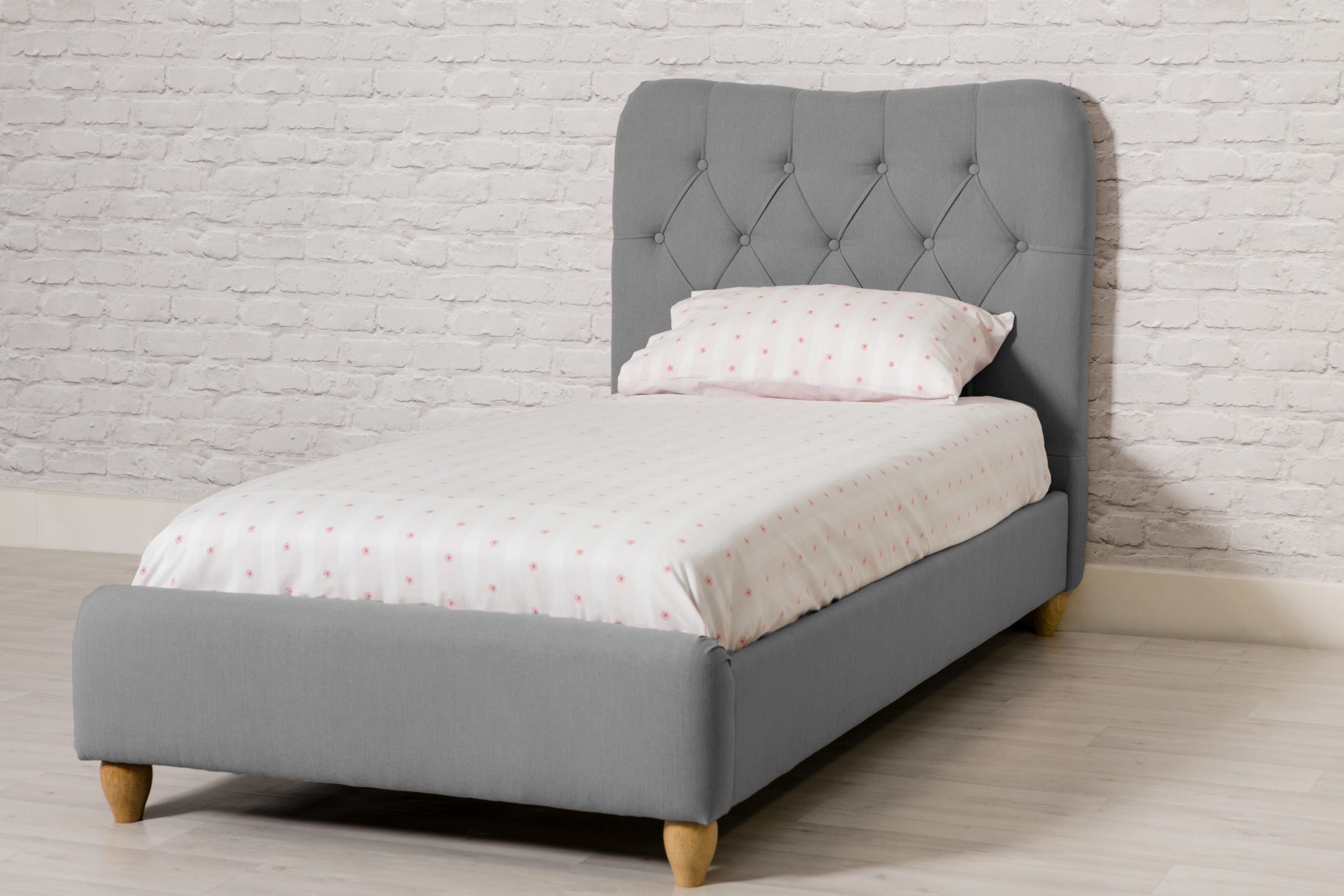 The Suzie designer bedframe offers an expertly crafted, padded, buttoned headboard which highlights its elegant curves. Finished in a grey fabric and with natural wood turned feet. A sprung slatted base for comfort. Boxed for home assembly. Available in 3′ and 4′ sizes. Bed being discontinued hence big price reduction.
