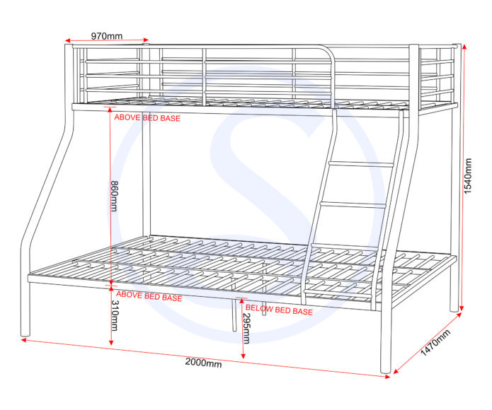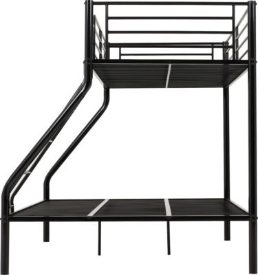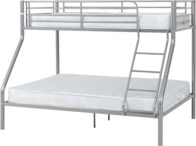 The Tandi Triple sleeper metal bunk bed is available in silver or black finish, the bunk has heavy duty metal base with centre support bar as well, 50mm tube posts, the top bed requires 1 x 90 x 190cm mattress, the bottom bed requires 1 x 135 x 190cm mattress. Boxed for home assembly.